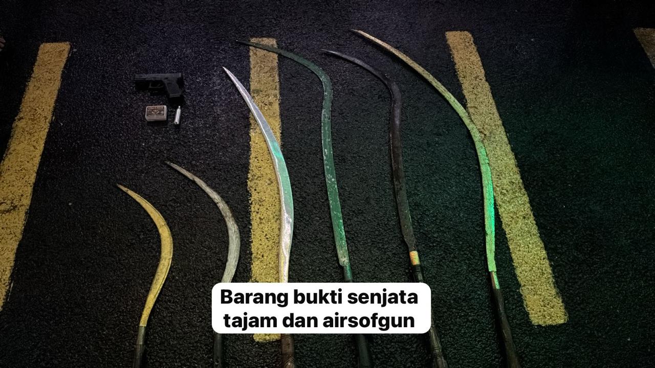 Barang bukti yang diamankan antara lain enam bilah senjata tajam jenis celurit, satu unit airsoft gun jenis Glock 19, empat unit telepon genggam, serta dua sepeda motor, yakni Honda Scoopy dan Honda Vario,”kata Onkoseno.