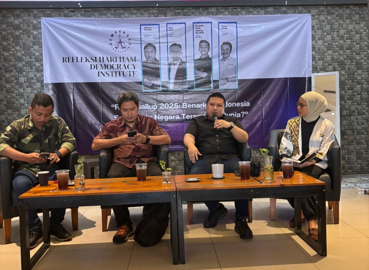 Pintasan.co, Jakarta – Democracy Institute bersama Yayasan Lembaga Bantuan Hukum Indonesia (YLBHI), para Aktivis Pro Hak Asasi Manusia, serta Ketua Umum Cendekia Muda Nusantara menggelar diskusi publik di Cerita Cafe, Tebet Jakarta Selatan bertajuk “Riset Gallup 2025: Benarkah Indonesia Salah Satu Negara Teraman di Dunia?”. Kegiatan ini digelar sebagai respons kritis terhadap hasil Global Safety Report 2025 yang menempatkan Indonesia sebagai salah satu negara teraman di dunia.
