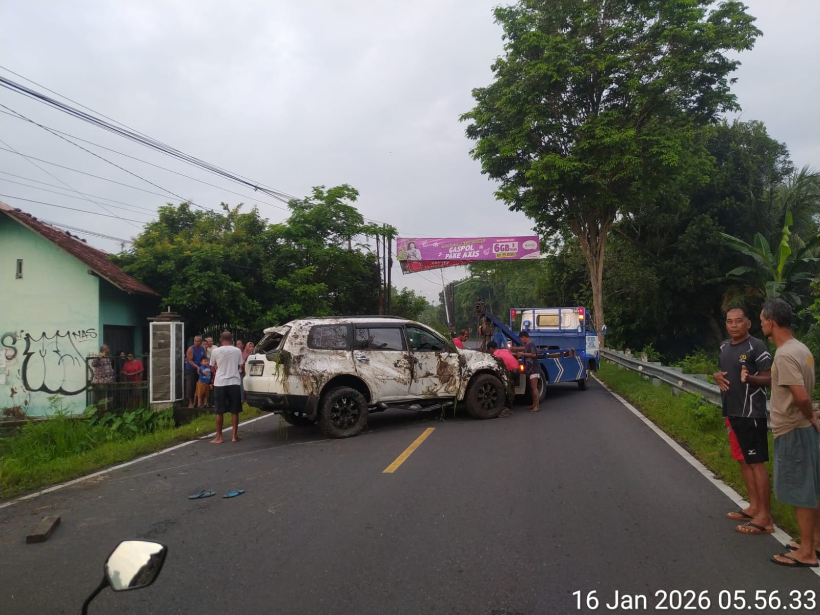 Pintasan.co, Bantul — Sebuah kecelakaan tunggal melibatkan mobil Mitsubishi Pajero terjadi di Jalan Parangtritis, Dusun Candi, Srihardono, Kapanewon Pundong, Jumat dini hari (16/1/2026) sekitar pukul 03.45 WIB.