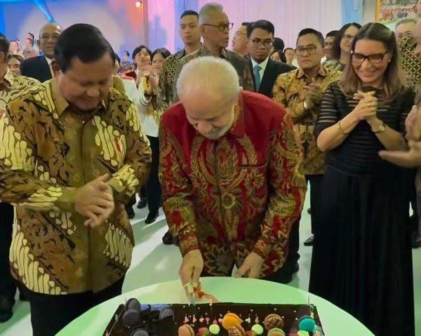 Dalam suasana akrab, Lula meniup lilin dan memotong kue ulang tahun, kemudian memberikan potongan pertama kepada Presiden Prabowo.