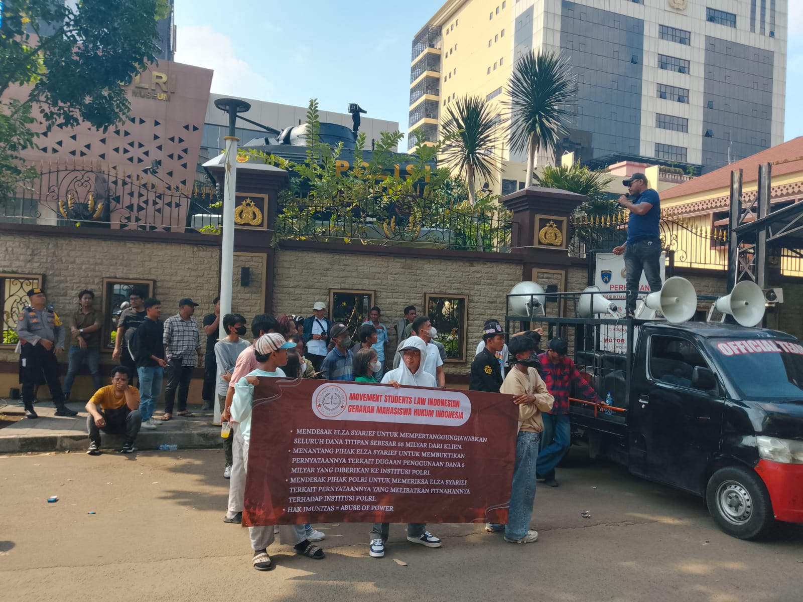 Pintasan.co, Jakarta – Gerakan Mahasiswa Hukum Indonesia (Movement Student Law Indonesian) menggelar aksi demonstrasi di depan kantor hukum Elza Syarief Law Office, Senin (20/4/2026). Aksi tersebut dilakukan untuk menyuarakan sejumlah tuntutan terkait dugaan persoalan dana klien yang hingga kini belum menemui kejelasan.