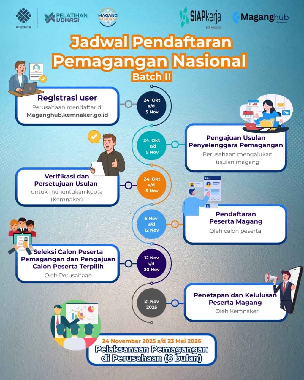 - 24 Okt-5 Nov 2025: Pendaftaran Perusahaan Penyelenggara (beserta jumlah lowongan)